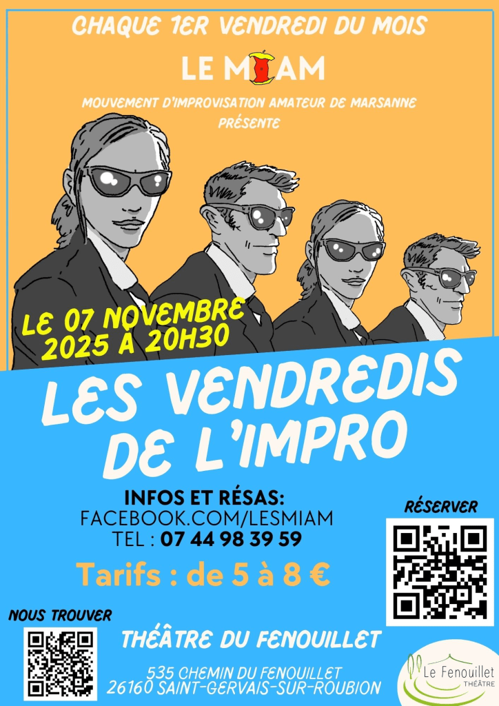 IMPROVISONS, pour cette troisième saison au Théâtre Le Fenouillet , le MIAM (Mouvement d’Improvisation Amateur de Marsanne) vous propose des histoires inédites, des moments uniques avec comme seul objectif : le plaisir de vous faire rire!!!